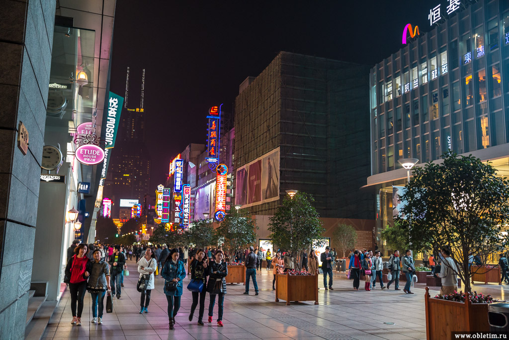 Нанкинская улица (Nanjing Road) – очень колоритная улица, особенно по вечерам: оживлённые толпы людей, яркие нейлоновые вывески магазинов и назойливые торговцы интим услуг и поддельных часов.