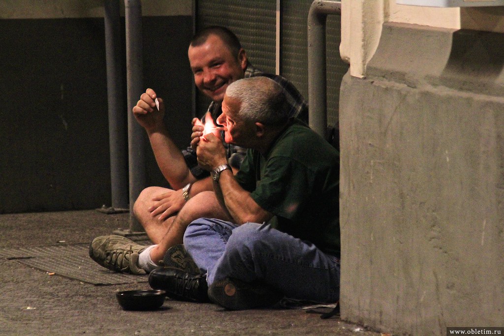 Помимо сидящих и лежащих бродяг, на тротуарах любят сидеть и валятся обычный народ. Люди просто садятся на тротуары, бордюры, асфальт. Их не смущает, что это не самые чистые места для отдыха. В этом случае вообще сложно отличить бродяги ли это или обычный люд.